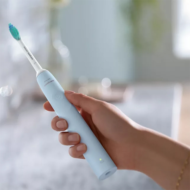 - Light blue electric toothbrush