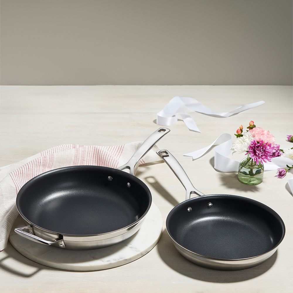 - Set of 2 stainless steel frying pans with no-stick coating