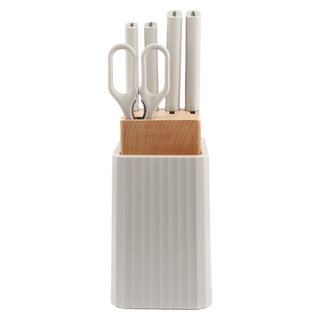 - Includes a 10cm paring knife, 10cm vegetable knife, 17cm Santoku knife, 21cm chef’s knife, and kitchen scissors with an integrated nutcracker