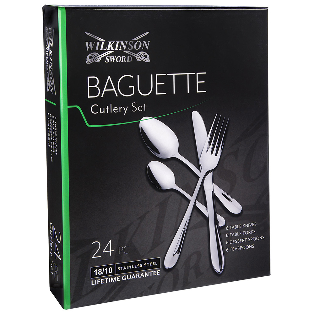 Since 1772, Wilkinson Sword Cutlery has been an elegant and functional addition to dining tables around the world. The cutting edge of quality, each piece is crafted from 18/10 stainless steel with sleek designs and smooth, classic contours — providing you with functional and durable flatware for everyday or occasional use. The Wilkinson Sword Baguette 24-piece cutlery set blends timeless elegance with everyday practicality. Crafted from high-quality stainless steel, each piece features the classic Baguette handle design—sleek, balanced, and comfortable in hand. Perfect for family meals or special occasions, the set includes everything you need for six place settings. Dishwasher safe for effortless care, it delivers lasting shine and durability, ensuring your table always looks as refined as your cuisine.