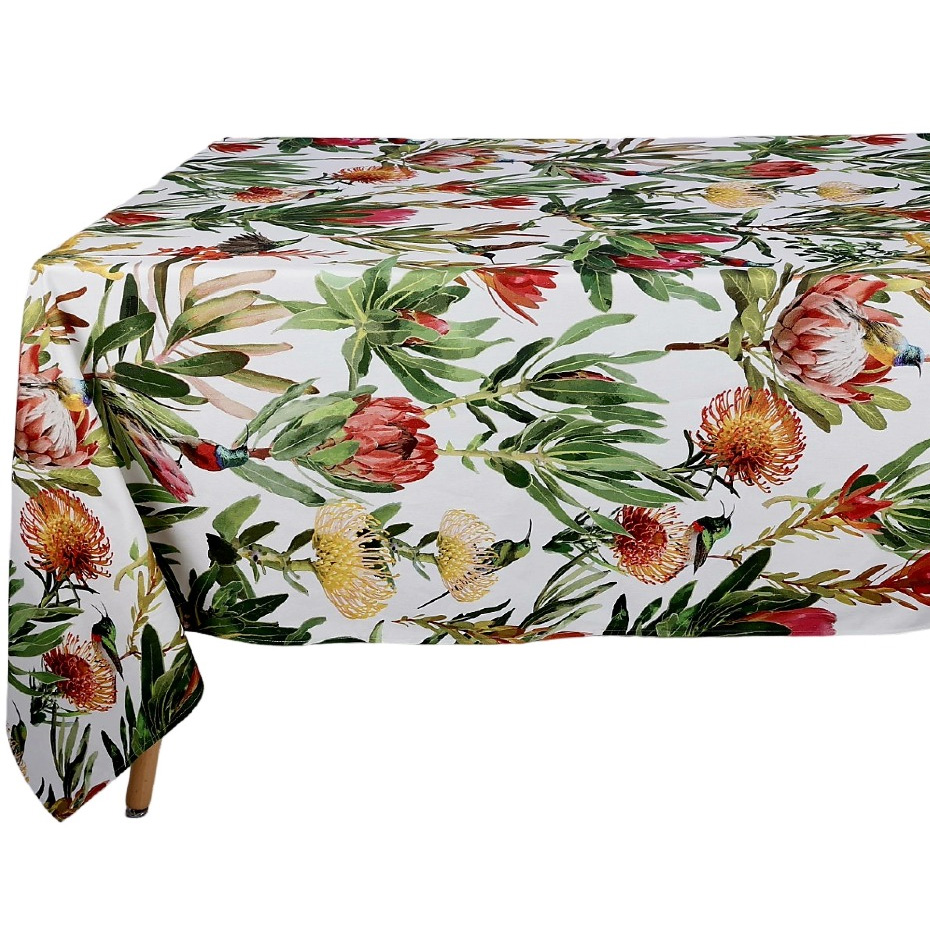 Bring paradise to your table with the Cape Sunbird Rectangular Tablecloth. Hand-painted flora and hummingbirds dance across crisp white cotton, bursting with tropical charm. Bold greens, pinks, yellows and reds pop against the fresh backdrop, making mealtimes feel like a lush escape. Stylish, durable, and practical — it’s dining with flair, every day. Set the scene beautifully.
