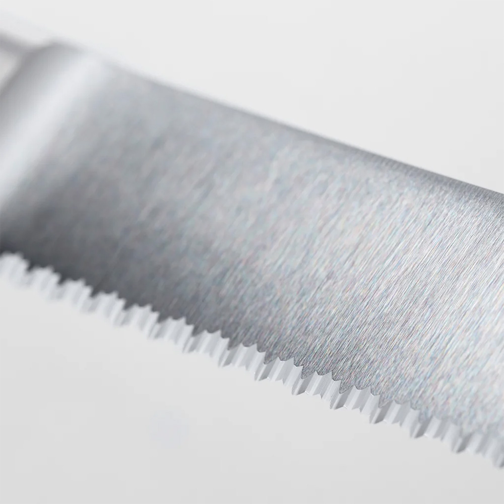Wüsthof’s precise, double-serrated edge makes a clear difference with this bread knife. In contrast with a single-serrated edge, this knife has serrations within the serrations, meaning that it remains sharp for longer, requires less pressure and is suitable for very precise, smooth cuts. Bread with a hard crust is not crushed when sliced with this double-serrated blade, while bread with a soft crust is also sliced cleanly, without any tearing of the delicate surface.