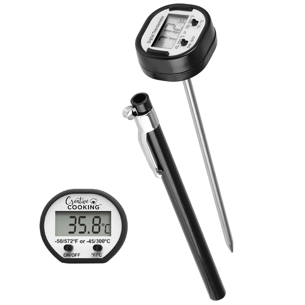 Ensure perfect cooking results with Creative Cooking’s Digital Food Thermometer. Featuring a sharp, sensitive probe, it delivers quick and accurate temperature readings from 45°C to 200°C —ideal for meats, baked goods, and confectionery. Compact and easy to use, it includes a plastic protective cover for safe storage. Whether you’re roasting, grilling, or tempering chocolate, this thermometer is an essential tool for precision cooking.