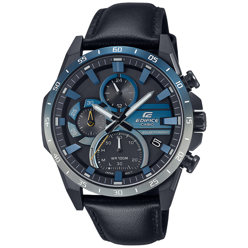 Love the feeling of cruising along darkened roadways? The glow of headlights and streetlamps cutting the deep blue of the night sky? Then you’ll love this Edifice timepiece designed to capture the mood of nighttime driving, made just right for the auto enthusiast. The thrill of driving city streets late at night is captured in the brilliantly gradiated color of the bezel—the night sky reproduced above in blue ion plating and the glow of lights below in the silver colour of titanium carbide processing, rendering a stunning bezel with an exquisite shine and is echoed on the dial’s components as well. This beauty also stores enough solar power for five months of normal use when fully charged.
