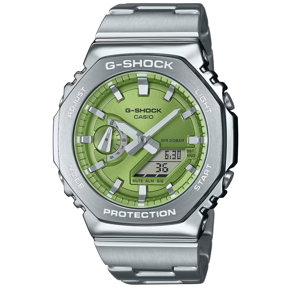 Introducing the GM-2110D — an analogue-digital combination G-Steel based on the GA-2100, now with a stylish metal bezel and band update. Meticulously forged and polished, the uniform octagonal stainless-steel bezel anchors a simple, no-fuss design with a sophisticated, yet tough look. Made of high-rigidity glass-fiber-reinforced fine resin, the case is the slimmest of all G-Shock combination models. The metal band, together with a pop of fresh color from the metallic brass dial, is up for anything — work or play.