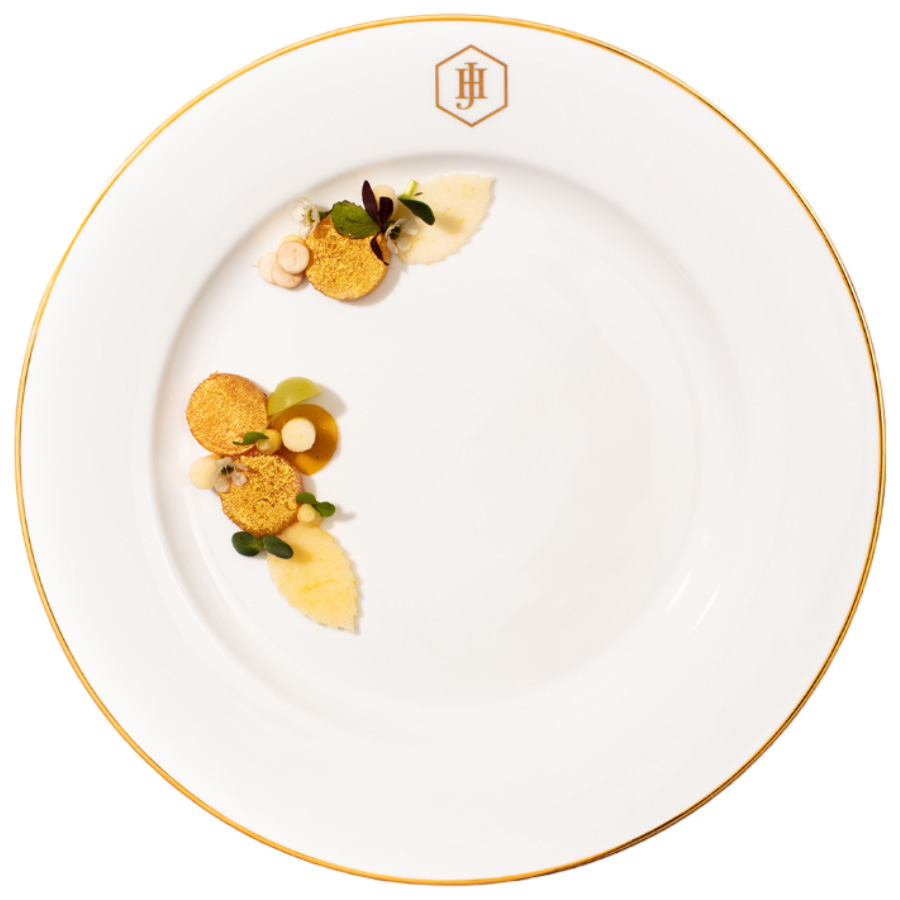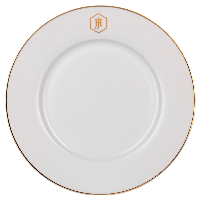 Crafted from the finest porcelain, the JAN Gold Rimmed Dinner Plate exudes timeless elegance and refined craftsmanship. Its pristine white surface is beautifully accented by a delicate gold band and the signature JH monogram, creating a sophisticated canvas for your culinary creations. Perfect for formal dinners or elevating everyday meals, this plate seamlessly blends luxury with functionality. Complete your table setting with the JAN collection for a cohesive and distinguished dining experience that impresses with every detail.