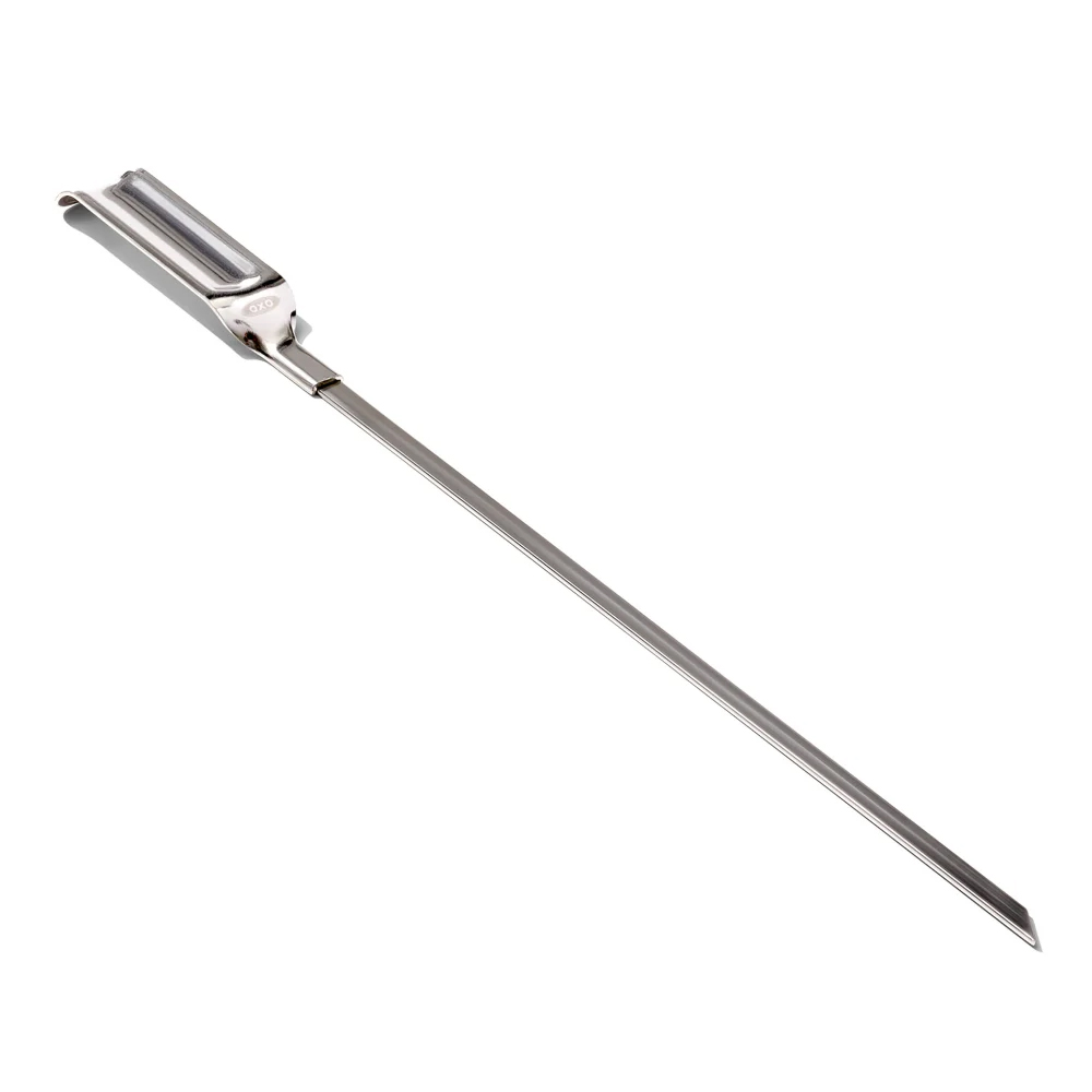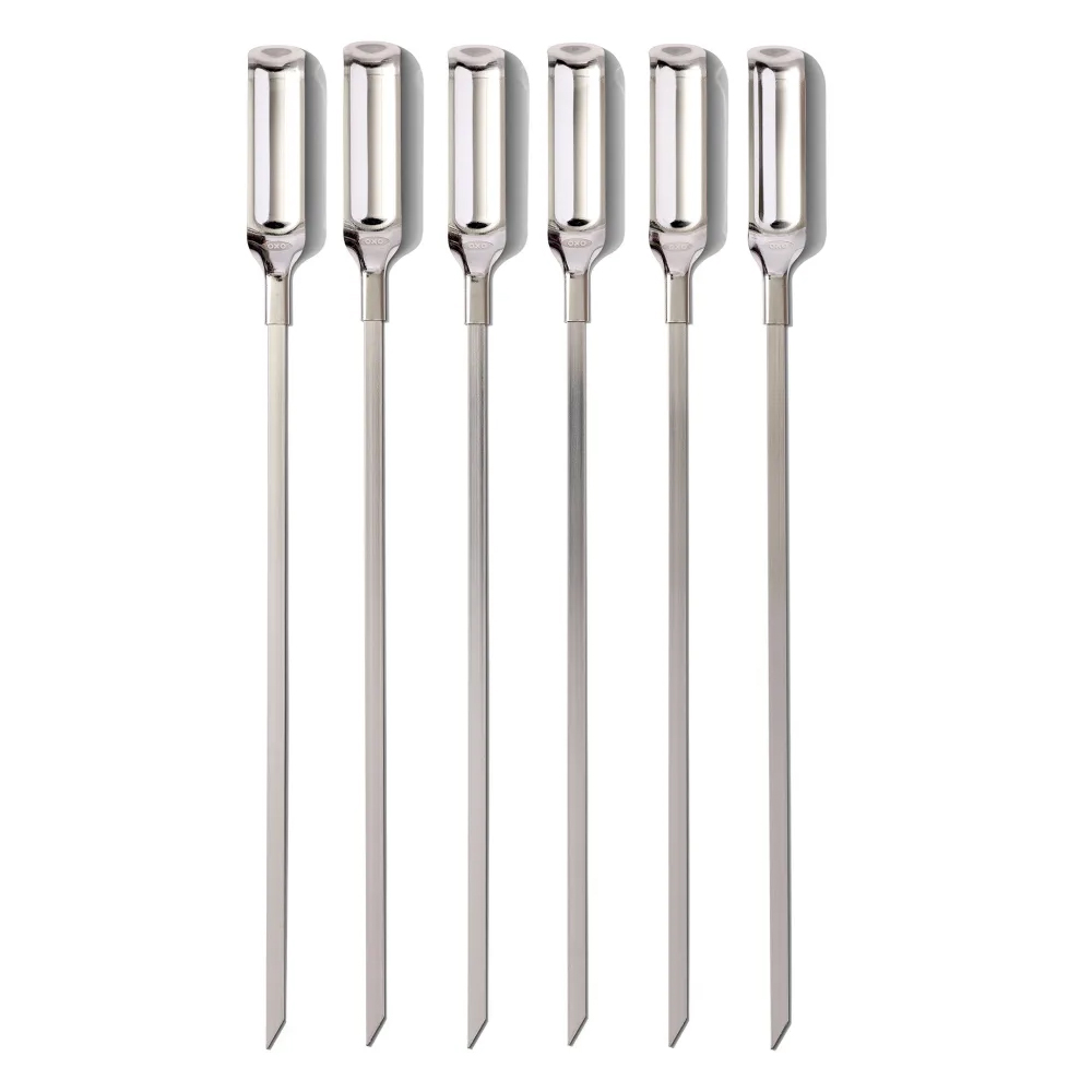 With the OXO Good Grips 6-Piece Grilling Skewers Set, ingredients slide onto the sharp points with ease, and the flat design keeps your kebabs steady as they cook. The skewers have wide handles for fumble-free flipping with tongs, and a thumb-sized divot for sliding cooked food onto the plate. The flat design also allows the handles to nest together for neat, space-saving storage.