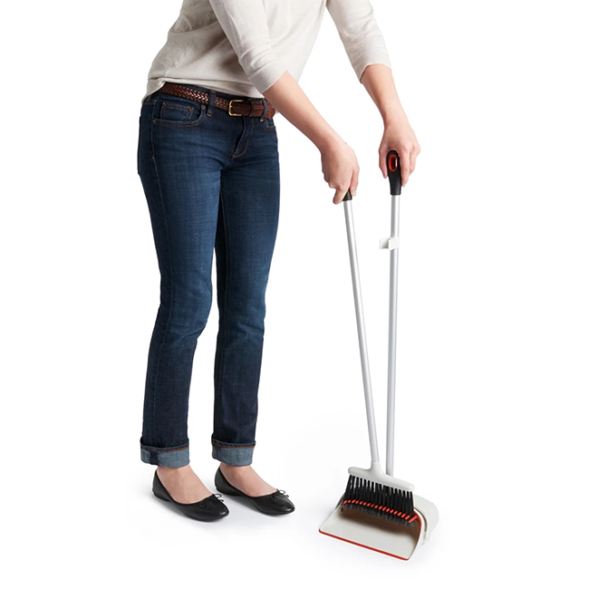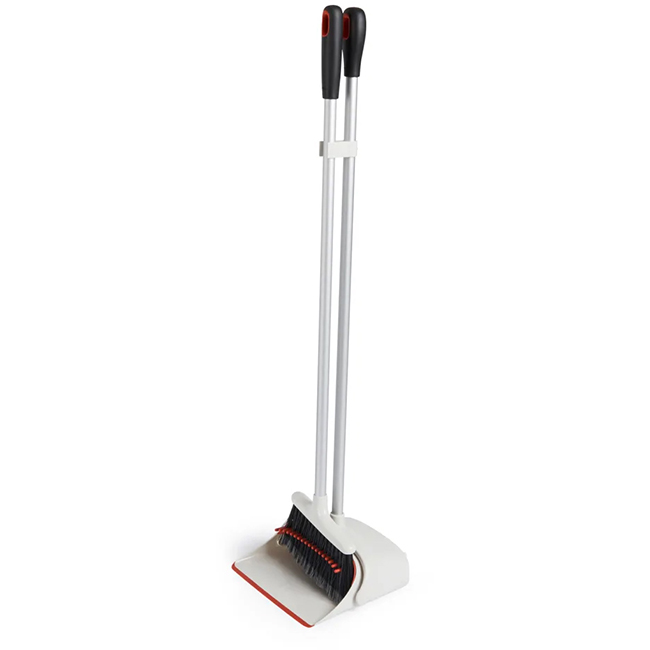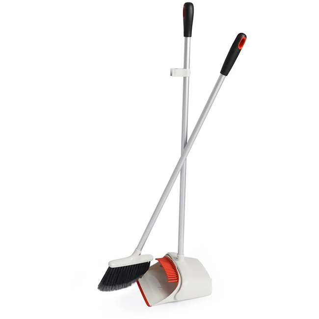 - Broom snaps to dustpan for upright storage