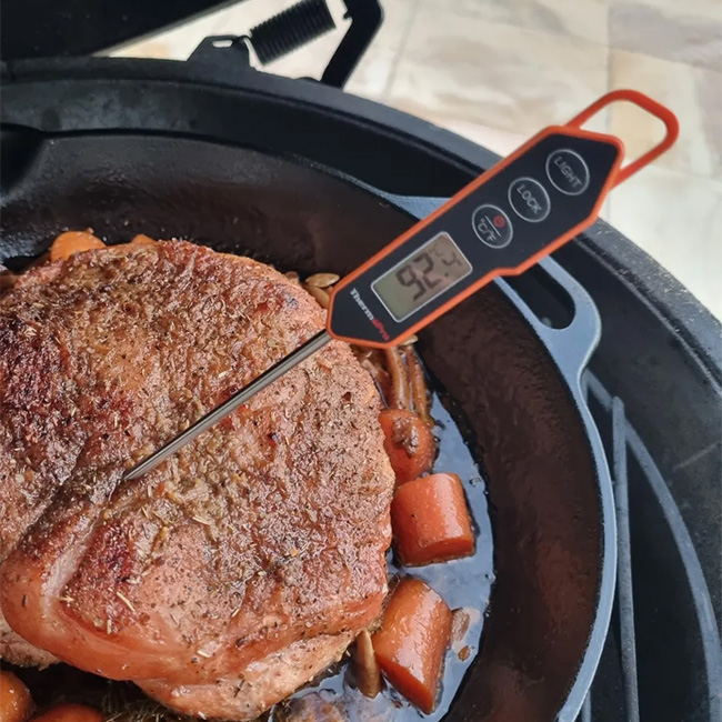 The Instant Read Digital Thermometer is a nifty, food-grade stainless steel probe with a step-down tip for accurate readings. The long length is ideal for keeping your hands away from the heat when cooking at the grill or in the oven.