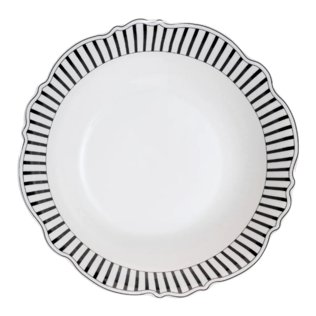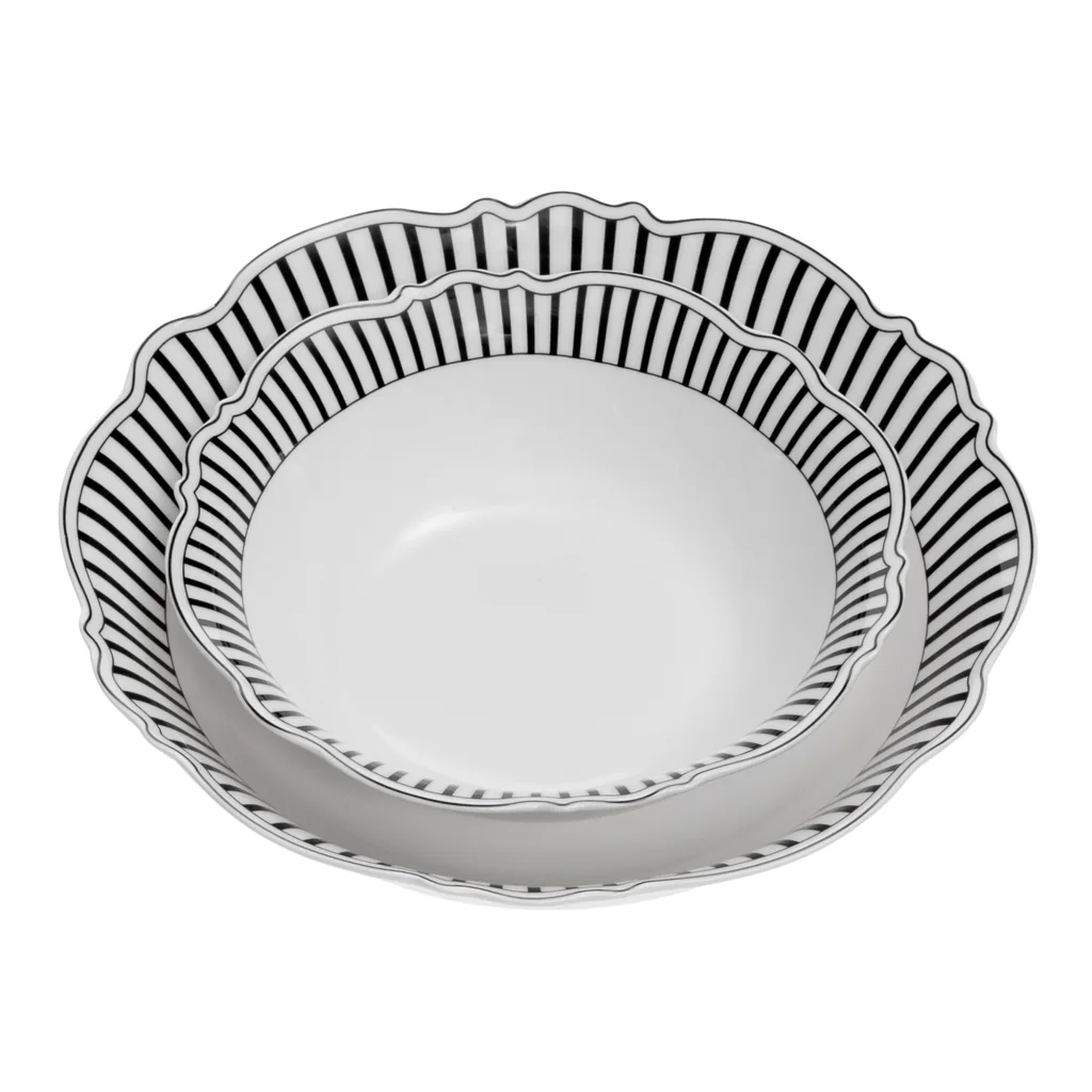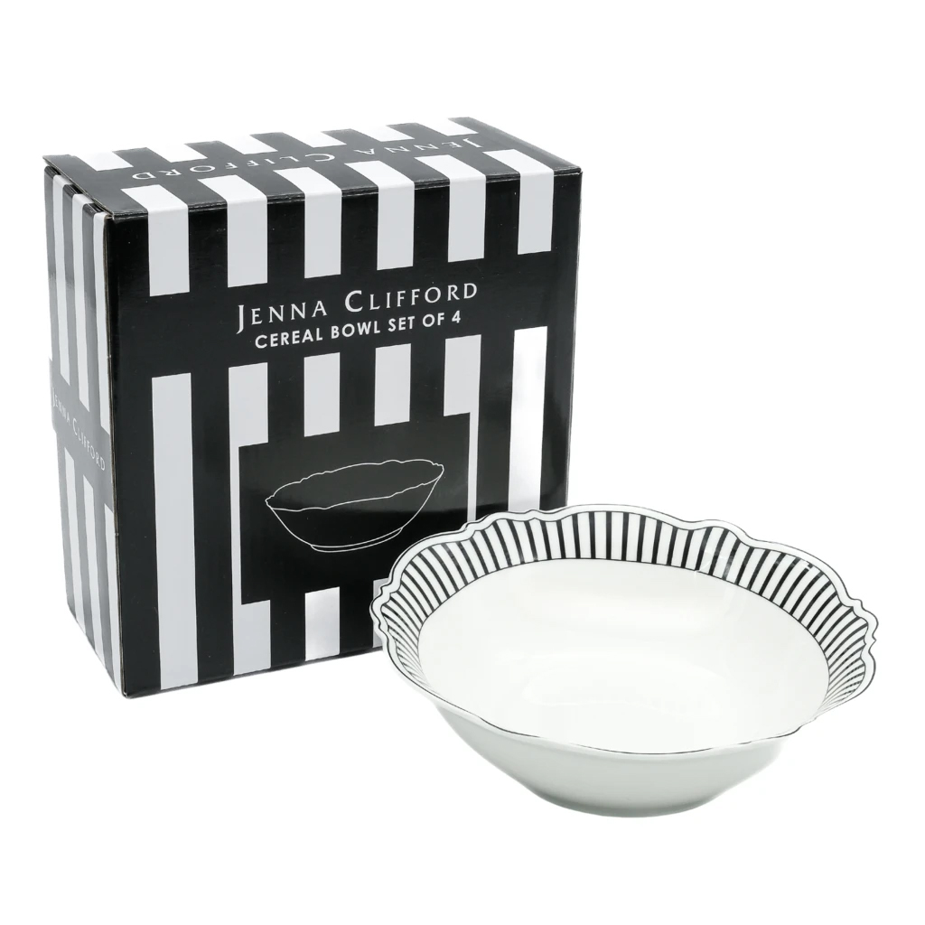 Jenna Clifford’s Ivory Noir Tableware Collection redefines timeless elegance with bold sophistication. Crafted from crisp white fine china and featuring striking monochrome stripes on delicate scalloped rims, each piece transforms everyday dining into a grand affair. The contrasting black and white design offers modern drama while retaining a classic appeal. Perfect for both casual dinners and formal entertaining, this collection is as versatile as it is stylish — true statement set for those who appreciate refined artistry and contemporary flair.