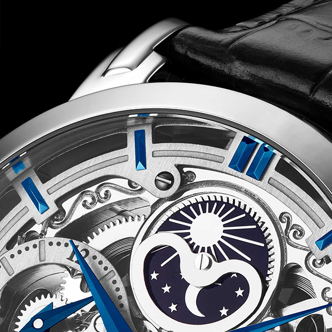 - Animated am-pm indicator and second time-zone sundial accentuated on a skeletonized dial