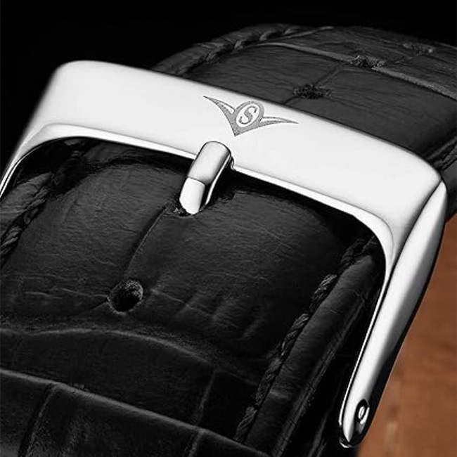 - Comes complete with a sleek leather strap that’s designed for both comfort and style. It wraps around your wrist with unparalleled comfort, ensuring a snug fit that’s perfect for daily wear. Finished with a secure tang buckle, it feels amazing and adds a touch of sophistication to your ensemble