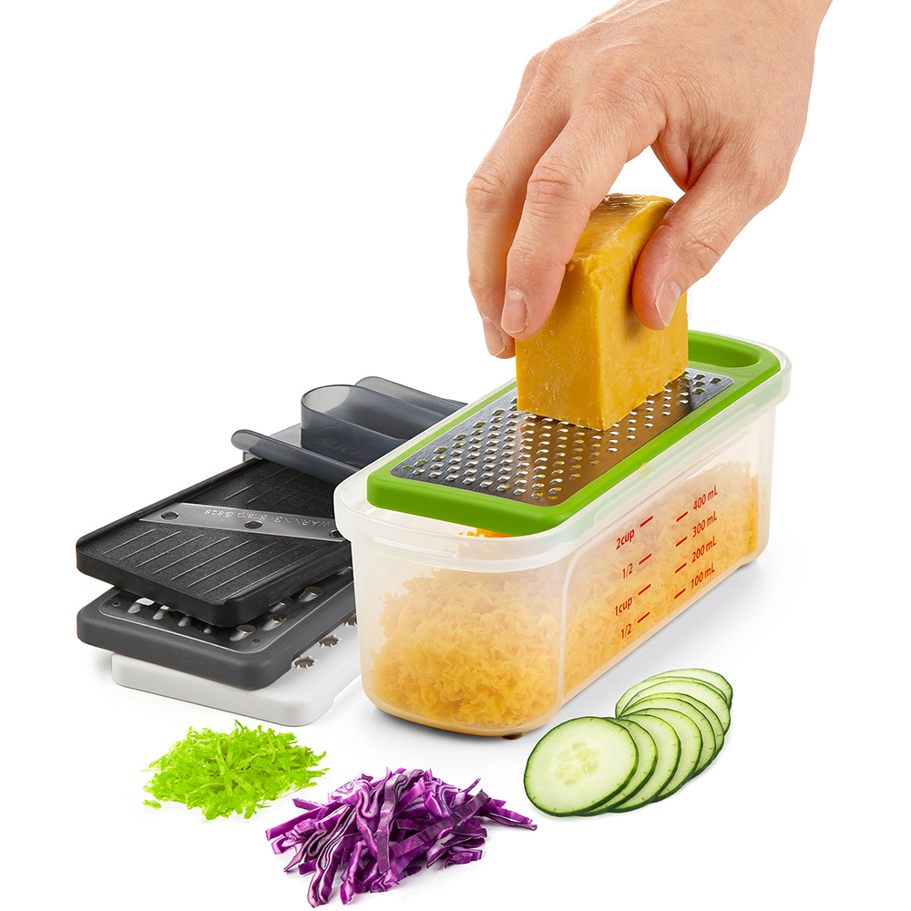 - Comes with a container that fits securely beneath the grater to catch and store grated food