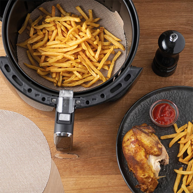 • Set of two round reusable air fryer liners