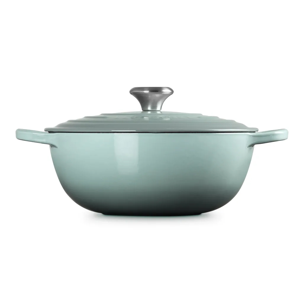The Le Creuset Signature Soup Pot is the ideal vessel for stovetop simmering, whether preparing stock or a hearty soup. Its sloped sides make stirring more efficient by promoting continuous movement even after the lid is in place. The durable black interior finish requires no seasoning.