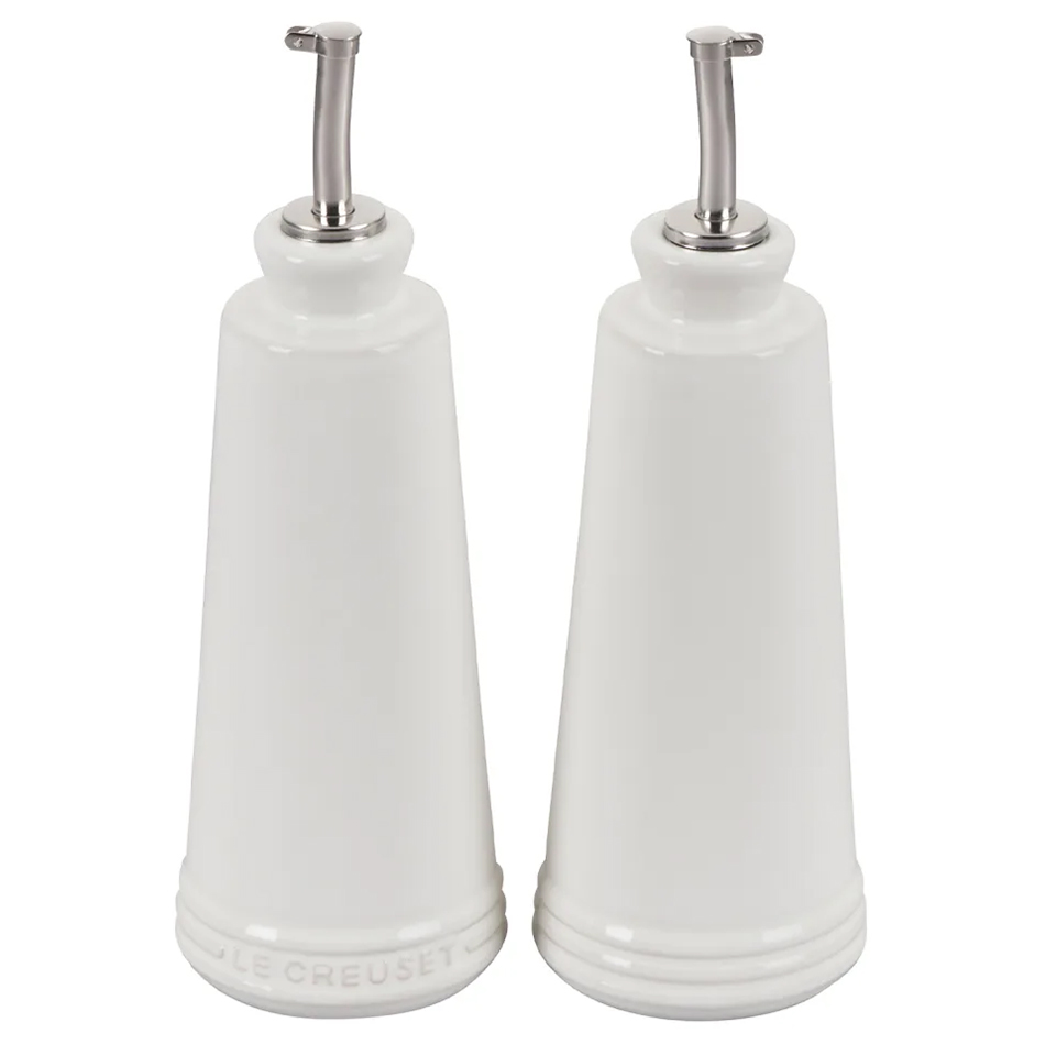 Whether dressing a salad or adding a drizzle of oil to a hot pan, this contemporary stoneware set is designed for everyday use. It includes one carafe with Le Creuset branding and one without for easy identification, along with stainless steel nozzles for precise pouring.