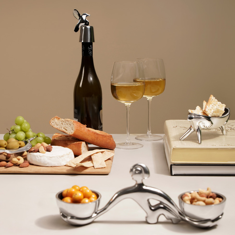 A timeless Nut Bowl to serve snacks in style. Polished to perfection, this oval bowl appears luminous and reflects the colours and shapes of its surroundings. As is her signature, this Carrol Boyes piece doubles as a point of interest amongst guests. Supported by two sculptural figures on each side, it’s crafted from cast aluminium, with a black powder coating on the inside providing improved durability. A wonderfully versatile item, ideal for serving olives, nuts, candies — it can also be used as tabletop storage for keys, jewellery, and other dainty items.
