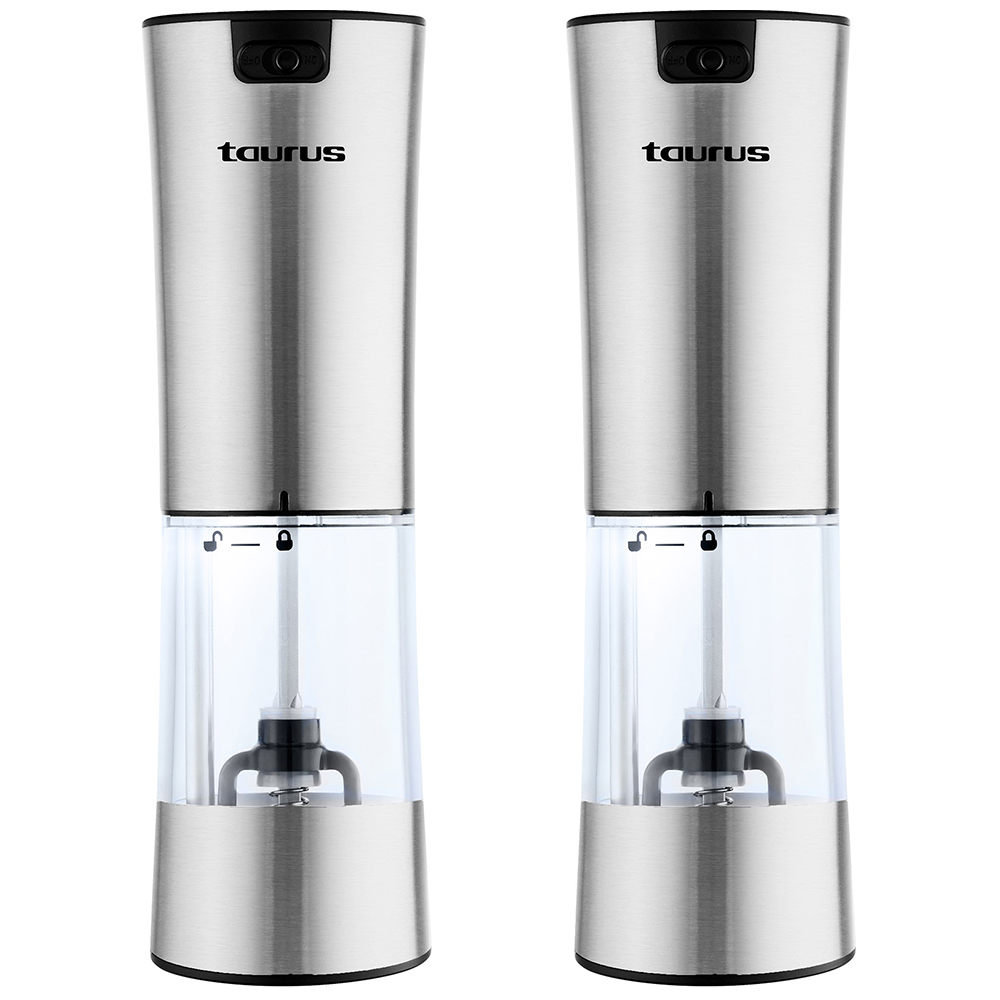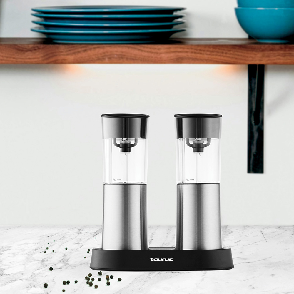 The Taurus Stainless Steel Rechargeable Salt & Pepper Grinder Set is a culinary essential that marries style and innovation. Equipped with a built-in rechargeable battery, ceramic anti-drop grinding core, and a gravity-sensing independent switch, this grinder set ensures precision in every sprinkle. Its retractable charging base, ultra-large transparent storage chamber, and soft LED illumination redefine convenience, bringing a touch of modern sophistication to your culinary experience.