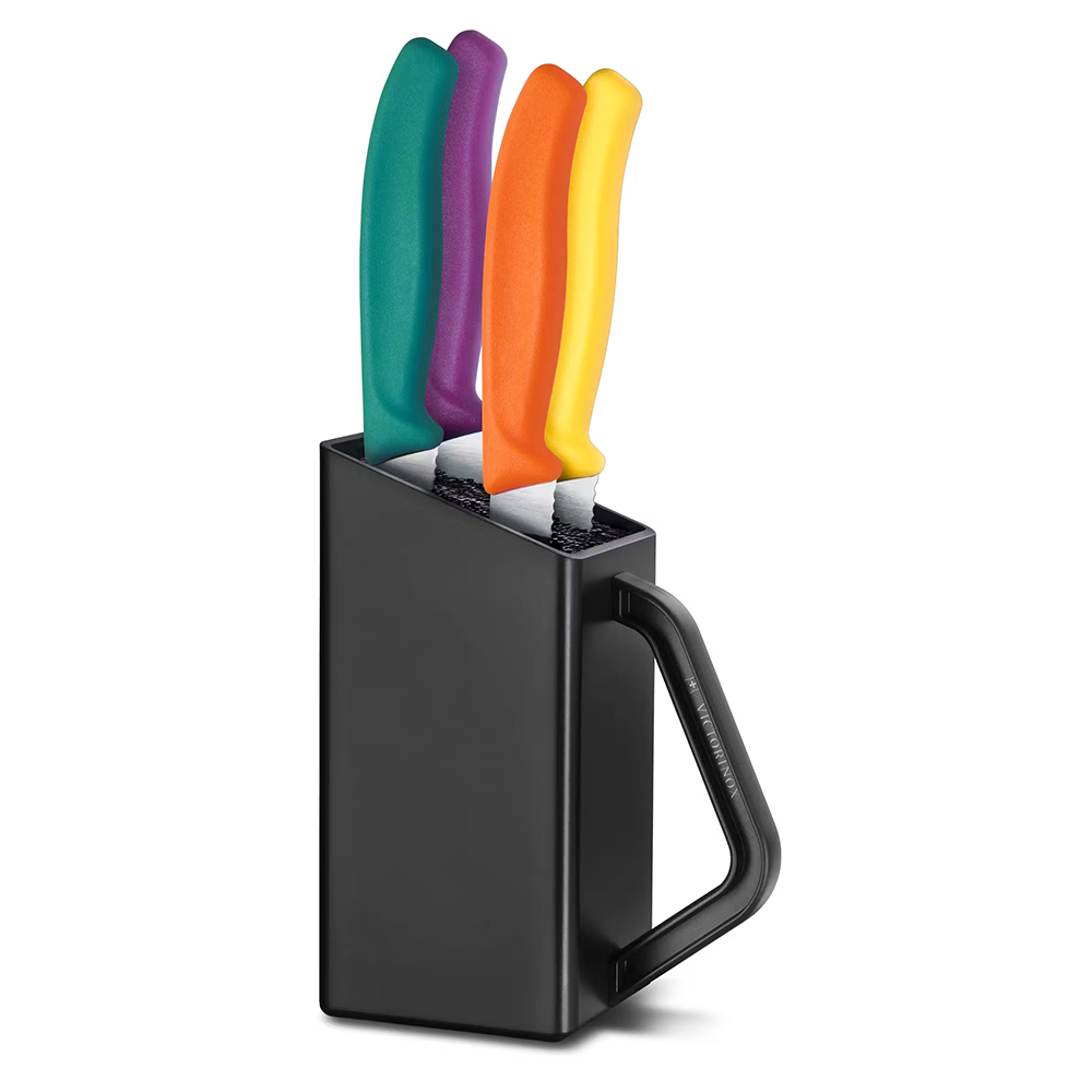 These vibrant knives slice through steak and pizza with cheeky charm, adding colour, comfort, and clean precision to every shared meal. Each wavy-edged blade glides smoothly, turning group dinners into effortless fun, while the sturdy block keeps everything tidy and ready. Great food deserves great tools — slice with flair!