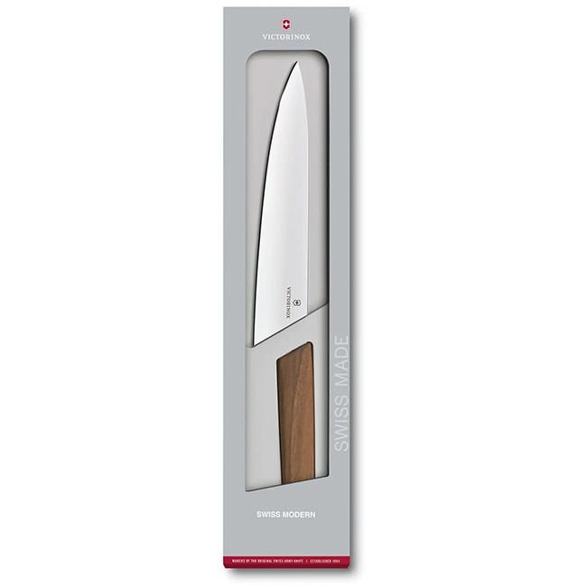 - Part of the Swiss Modern Collection, this knife features a unique, richly grained European walnut wood handle