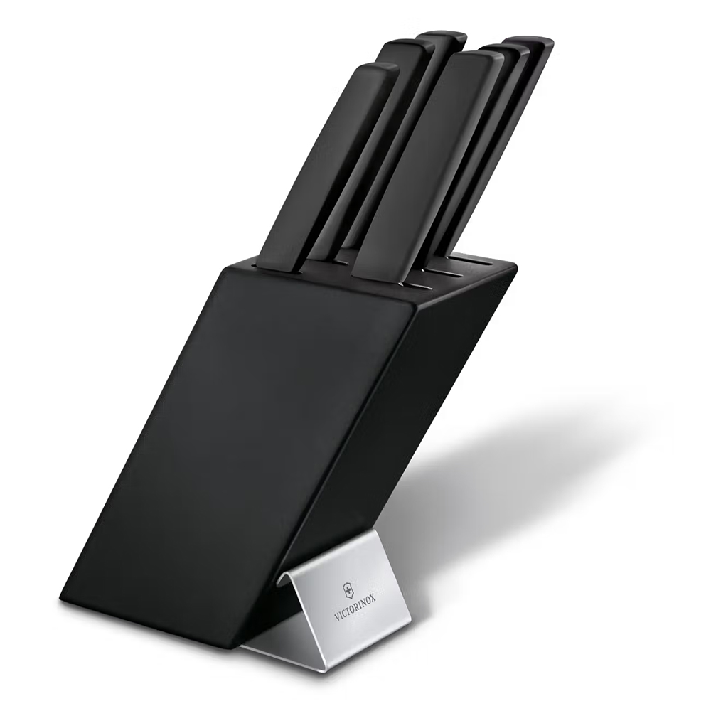 This Modern Knife Block brings sleek style and sharp purpose to your countertop, crafted from beech wood and finished in a bold black sheen. Its angled form mirrors the smooth synthetic handles it shelters, while the engraved logo adds cool confidence. It stores safely, performs swiftly and looks downright brilliant — kitchen swagger achieved.