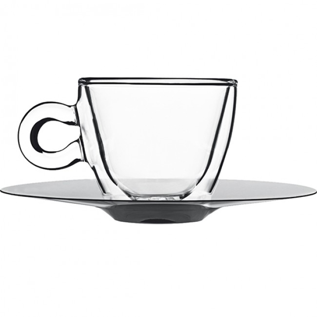 - Set includes 2 glass cups and 2 stainless steel saucers