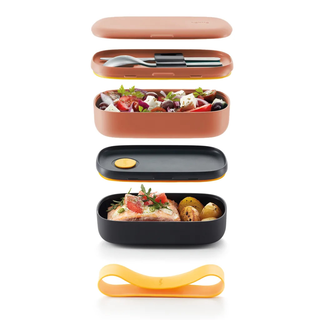 - Includes an extra lid on the upper part for storing cutlery (Not included)
